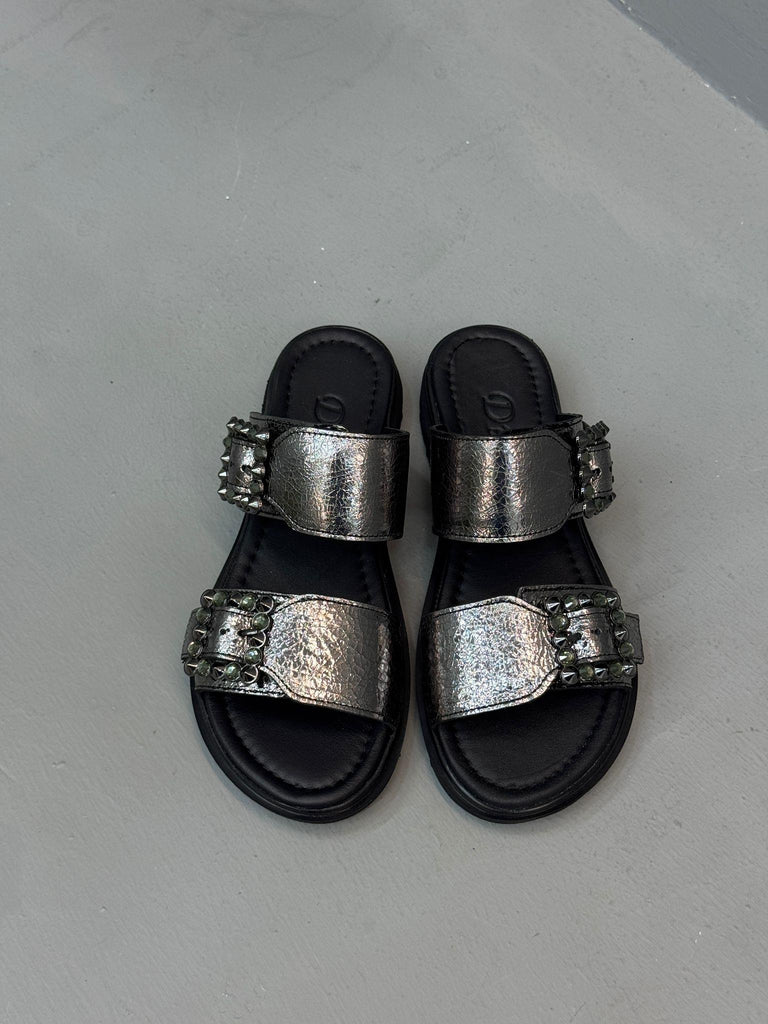 Platin Deri Taşlı Çift Bantlı Kadın Günlük Terlik